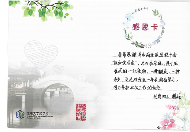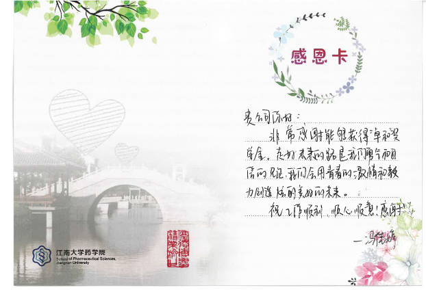 自2018年起,我司與江南大學(xué)友好協(xié)商后,于江南大學(xué)藥學(xué)院設(shè)立了“卓和”獎學(xué)(教)金,旨在鼓勵、資助有意在制藥及相關(guān)行業(yè)發(fā)展的學(xué)生刻苦學(xué)習(xí)、自強(qiáng)成才;同時對熱愛教育事業(yè)、樂于奉獻(xiàn),并受到廣大學(xué)子敬重和信賴的教師予以表彰。頒獎典禮過后,獲得獎學(xué)金的同學(xué)紛紛寫來感恩卡,同學(xué)們的肯定也是對我們的鞭策和激勵,我們愿為制藥行業(yè)的人才培養(yǎng)貢獻(xiàn)更多的力量。